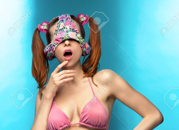 Young woman posing in bikini without panties, bottom of bikini on head