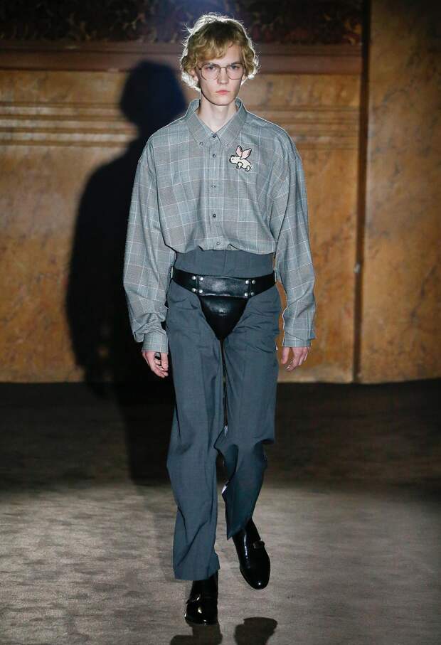 Элементы БДСМ настолько прочно внедрились даже в формальную будничную одежду, что мы редко замечаем их присутствие. Бандажные кожаные трусы от Gucci нарочито морщат брюки, напоминая о традиционном дискомфорте в БДСМ-практиках. Впрочем, этот элемент одежды правильнее назвать гульфиком на ремешках. Удобно, если хочется одновременно и подчеркнуть, и скрыть «мужское достоинство».