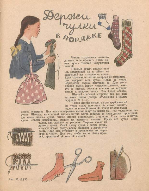 Ввиду дефицита, неизменного спутника военного времени, даже в детских журналах печатали советы по экономии. Сейчас редко кто штопает свои носки и уж тем более чулки, ведь проще купить новую пару. Будем надеяться, что нам с вами приведённые выше советы не пригодятся.