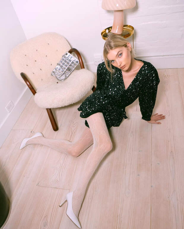 На Эльзе — белые ажурные колготки от Gucci. Стоимость экземпляра на официальном сайте бренда — 90 евро.