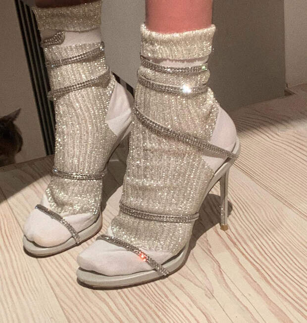 Эльза — натуральная блондинка (немного рыжинки — не в счёт), и часто носит белое. Одна из её недавних эффектных находок — это толстые белые носочки с люрексовой нити в сочетании с белыми босоножками.