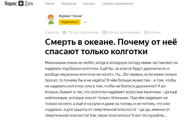Инициатором горячих обсуждений опасности медуз по информации редакции bracatuS.com стал детский дзен-журнал «Лучик», 2-го августа разместивший статью с заголовком «Смерть в океане. Почему от неё спасают только колготки». Пикантное начало поднимает вопрос ношения колготок мальчиками, рассказывая о том, что мамы нередко заставляют представителей сильного пола надевать колготки под брюки «для тепла», а затем противопоставляя факт о том, когда взрослые мужчины надевают «нейлоновые колготки, которые «носят только тётеньки» не только на ноги, но и на руки и голову «для защиты от смертельной опасности».