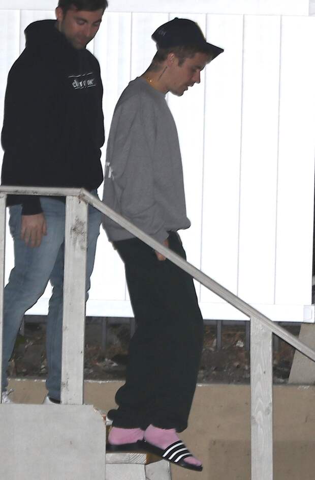 Шлёпанцы с носками — частый выбор знаменитостей. Например, Джастит Бибер в марте 2019-го года был замечен в розовых носках и чёрных с белыми полосками шлёпанцах.
