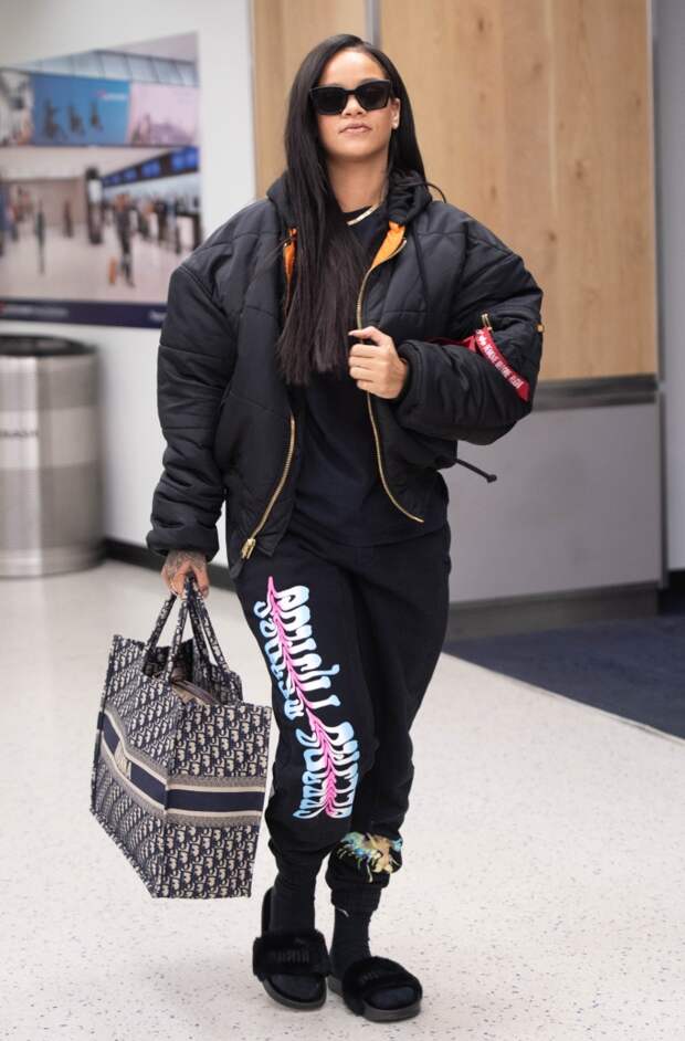 В июне 2018-го Рианна была замечена в меховых шлёпанцах Fenty Puma и в чёрных носках.