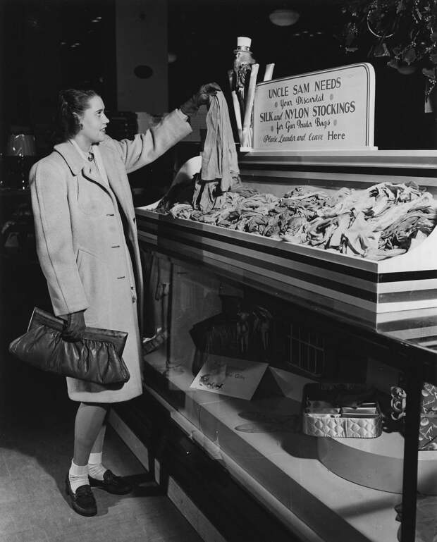Эти изношенные нейлоновые чулки будут переработаны и превращены в парашюты для военных летчиков. 1942 год.