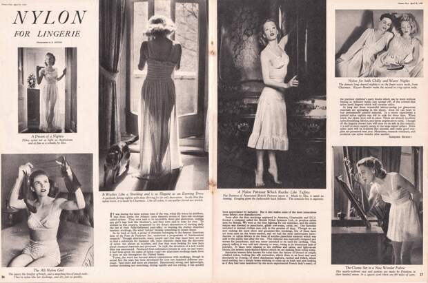 Коммерческое использование нейлона началось в 1938 году с производства зубных щёток с нейлоновой щетиной. Изготовление чулок началось позже: «нейлонки» были представлены на Всемирной выставке 1939 года в Нью-Йорке, а впервые поступили в свободную продажу в 1940-м году. Во время Второй Мировой войны почти всё производство нейлона было перенаправлено на военные цели — для производства парашютов и парашютных шнуров. Использование нейлона и других пластмасс в военное время значительно увеличило рынок новых материалов.