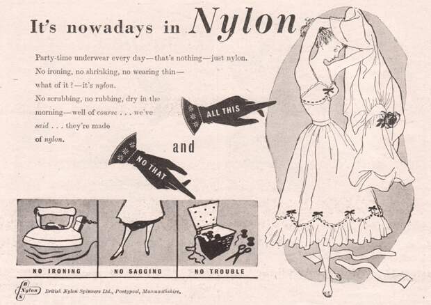 DuPont изменил стратегию рекламной кампании, подчеркнув, что нейлон сделан из «угля, воздуха и воды», и начал концентрироваться на эстетических свойствах нейлона, а не на его технических качествах. Таким образом, нейлон получил общественное одобрение и всё внимание переключилось на материально-потребительский аспект волокна и поддерживалось слоганами вроде «Если это нейлон, то это красивее» и «О! Как быстро он высыхает!».