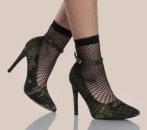 Рукодельницы предлагали проделывать в носках дырки под каблуки, чтобы впоследствии без дополнительных сложностей надевать первое на второе. Модельеры предложили своё решение, но остаётся вопрос: как поступить с туфлями, когда по носкам побегут стрелки?Аналогичная модель, дополненная перемычками на щиколотке, визуально запутывает: сетчатые носки кажутся надетыми поверх туфель, но под ремешками-застёжками.