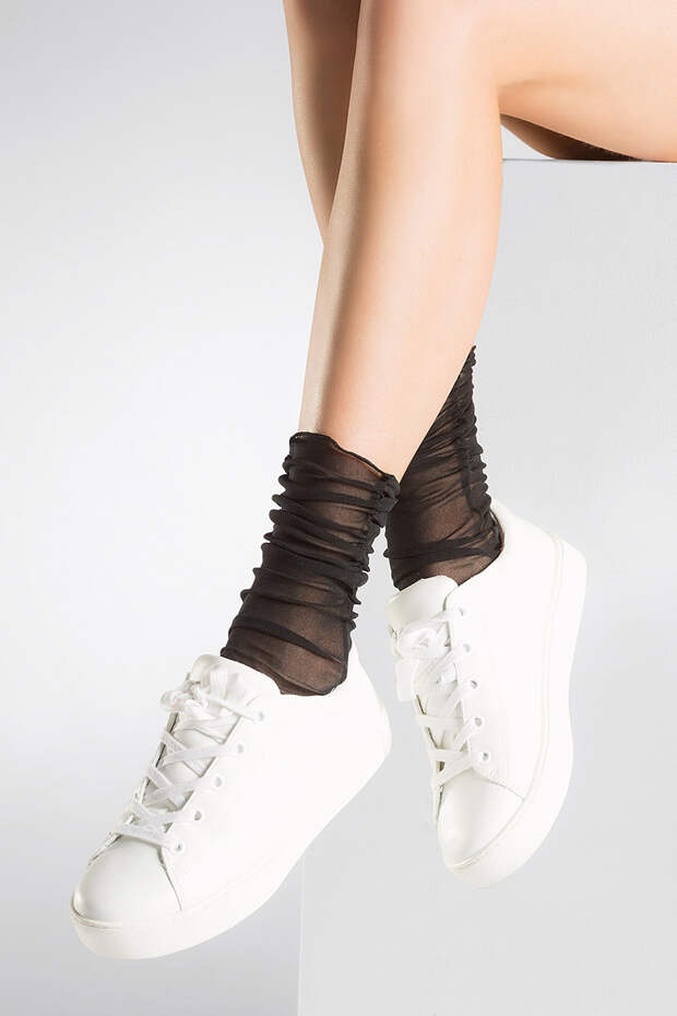Широкая, свободная верхняя часть этих носочков кажется сделанной из мятой папиросной бумаги. При первом взгляде несведущий в моде человек подумает, что вы зачем-то обернули вокруг щиколоток одноразовые салфетки.